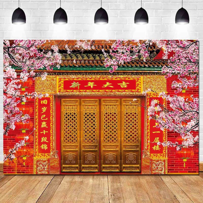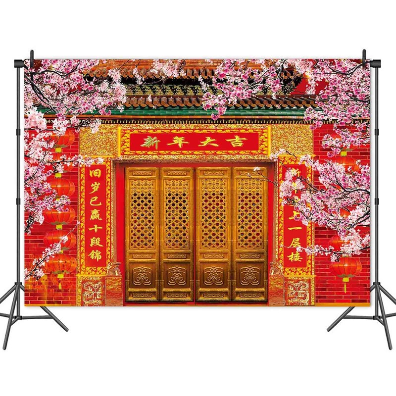 Chinese Spring Festival Photography Backdrop New Year Red Lantern Pink Plum Blossoms Trees Photo Background 7x5ft for Family Party Portrait Studio Props