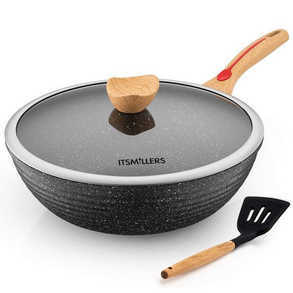 - ❤HEALTHY COOKING - ITSMILLERS marble designed four layers nonstick coating stir fry wok ss free of PTFE and PFOA, which allows you and your family to cook with less oil or butter. Our nonstick coating makes food release/cleaning easy and is cadmium and lead free. It is not only environmentally friendly, but also makes the diet healthier and safer.