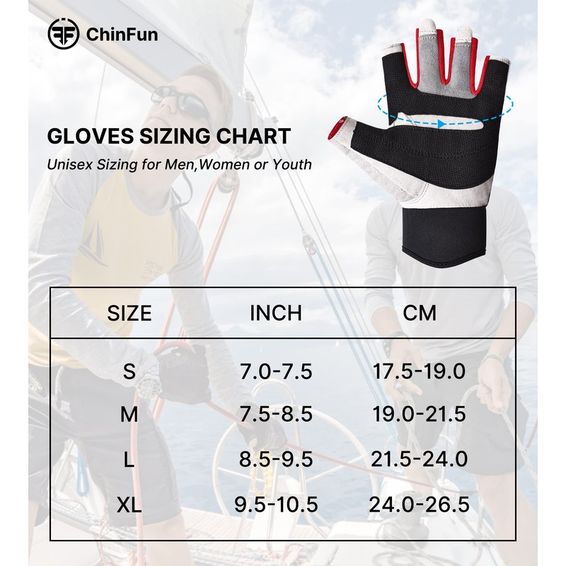 ChinFun Unisex Sailing Gloves Fingerless Great Grip for Water Sports, Sailing, Paddling, Canoeing, Kayaking Comfort Fit Fishing for Men and Women Red L