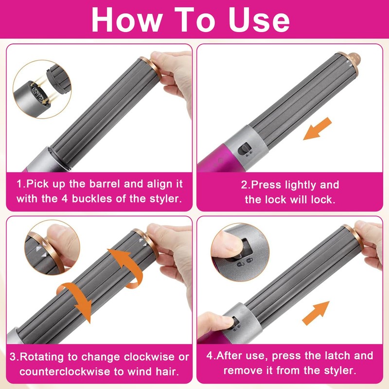 - Bi-directional curls: simply twist the tip of the attachment to change the airflow direction - so you get left/right curls (clockwise/counterclockwise).