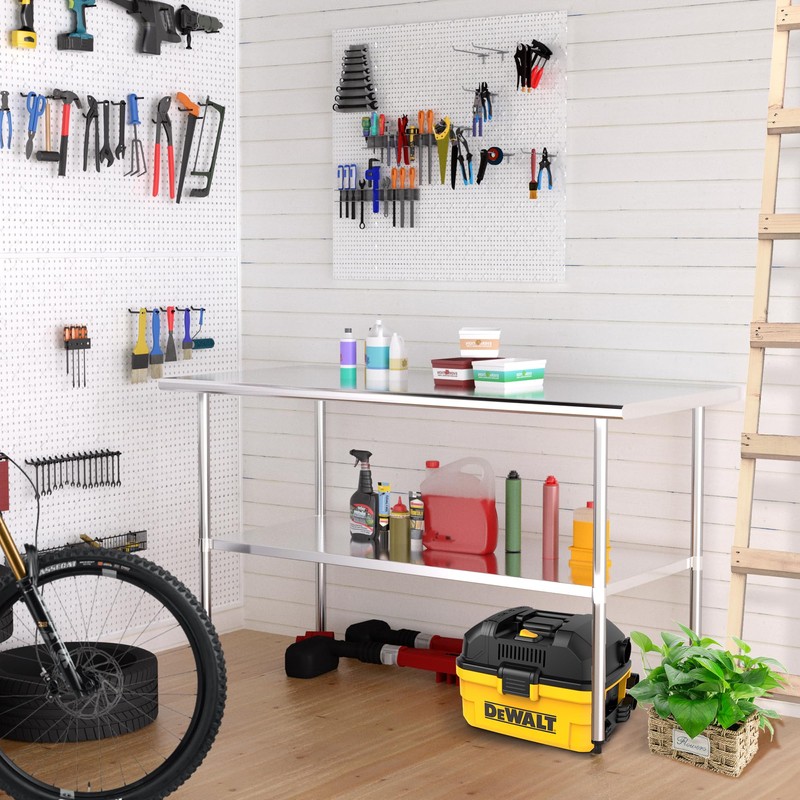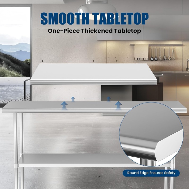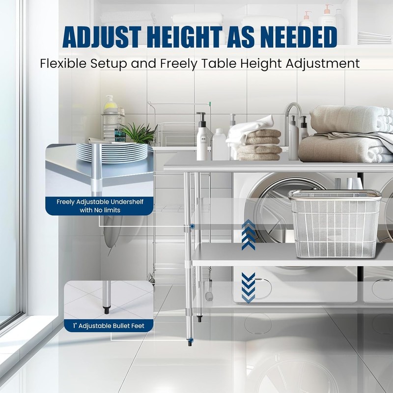 - Ample Work Area: Measuring 60x30x34 inches, this stainless steel kitchen table provides a generous workspace and adjustable shelf. Can bear weights up to 530 pounds on the table and 430 pounds per shelf, accommodating various storage needs