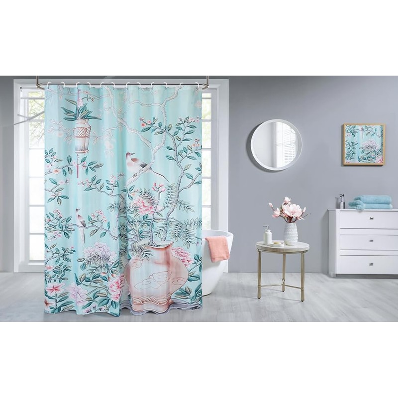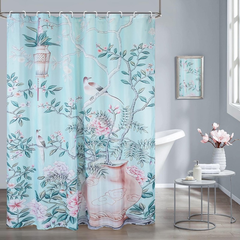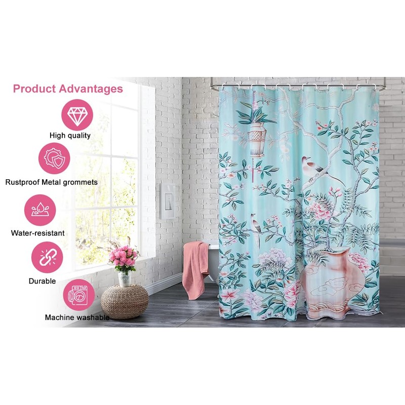 - 【Dimension】72W*72H inch(183W*183H cm); 90GSM(Gram Per Square Meter);380g(Grams). Package includes 1 Teal Blue Chinoiserie Flower And Bird Pattern Printed Shower Curtain and 12 Plastic Hooks. It is very suitable for normal size bathtubs in home bathrooms, camping sites, hotels, and more.