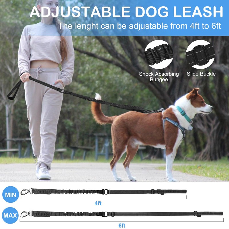 - Shock Absorbing Bungee Dog Leash: The dog leashes for large dogs heavy duty uses innovative Zero Shock BUNGEE Technology,can be stretched to a maximum length of 6ft.Improve control and cushion, eases the pressure for both the owner and the dog,makes dogs' walking enjoyable