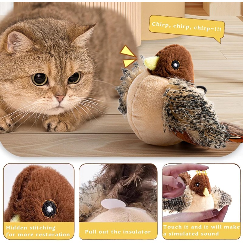 • Chirping Bird Cat Toy: Keep your indoor cat active and entertained with our interactive bird toy. The realistic chirping sounds and flapping wings mimic a real bird, stimulating your cat's natural instincts and providing them with plenty of happiness