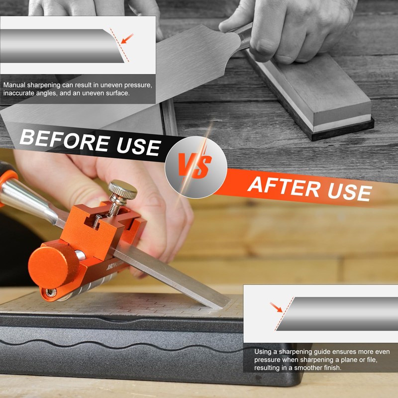 - UPGRADED SHARPENING JIG AND WHETSTONE - Our improved chisel sharpener is made of high-density aluminum alloy, which can fix and fine-tune the angle of the chisel and whetstone edge. With the included diamond whetstone (2-sided grit 400/1000), the entire blade can be sharpened evenly