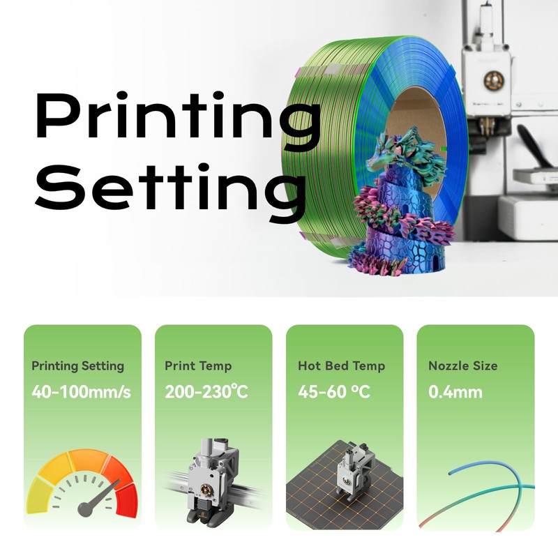 • 【Dual Color Silk PLA】We offer a wide range of colors to cater to your creative requirements. Whether you're creating intricate jewelry, artistic sculptures, functional prototypes, or decorative household items, silk PLA offers the versatility to bring your ideas to life. Its combination of strength, flexibility, and visual appeal makes it a popular choice among makers and designers