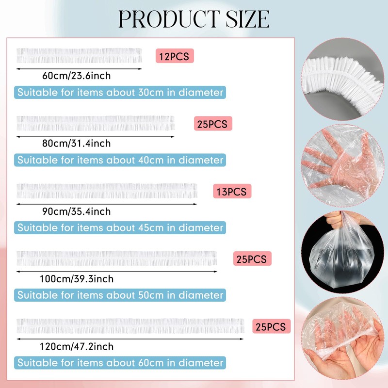 - Efficiency in One Package: get more out of your protection; Each pack includes 100 disposable kitchen appliance covers in 5 varying sizes, about 31.4 inches/ 80 cm (25 pcs), 39.3 inches/ 100 cm (25 pcs), 47.2 inches/ 120 cm (25 pcs), 35.4 inches/ 90 cm (13 pcs), 23.6 inches/ 60 cm (12 pcs), suitable for different appliances; Additionally, you can use appliance covers sets again if their surface remains undamaged
