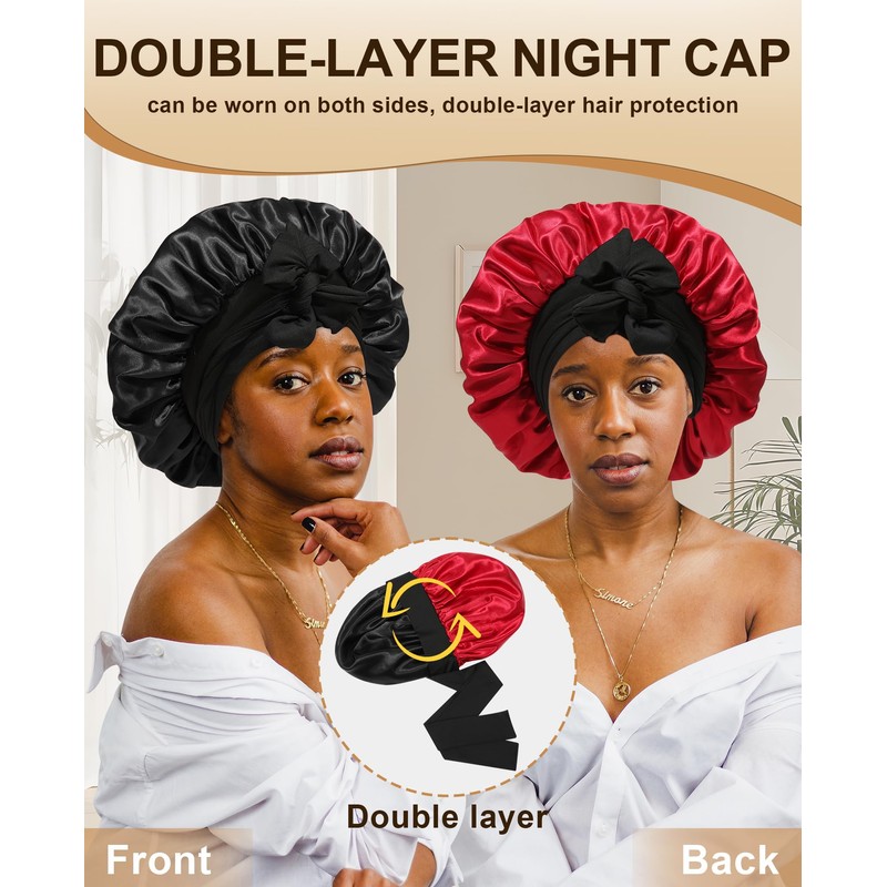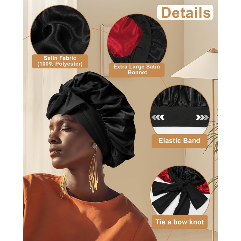 CHLINS Extra Large Satin Bonnet Double Layer Sleep Hair Bonnet with Elastic Tie Band(Black+Red)