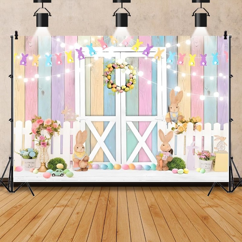 Chloroplastid Colorful Easter Backdrop with Spring Flowers, Easter Bunny Rabbits, Eggs - Vinyl, 10x8FT, Pink Blue Yellow