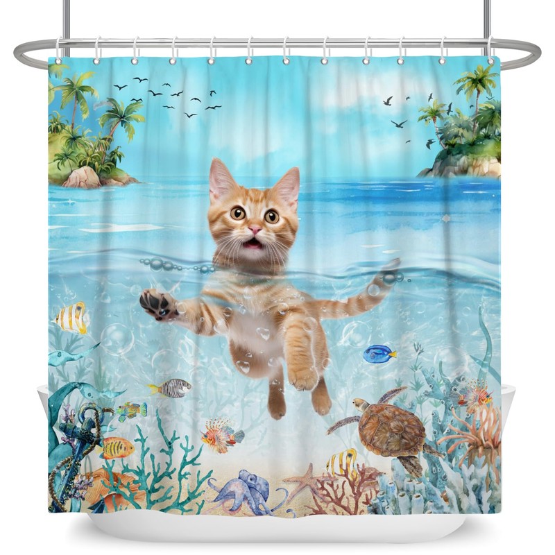 ChloropLastid Funny Cat Shower Curtain Ocean Lovely Swimming Kitten Turtle Coral Fish Tropical Nautical Bathroom Curtain 72x72 inch Cute Bthroom Decor Gifts for Kids Soft Waterproof Fabric