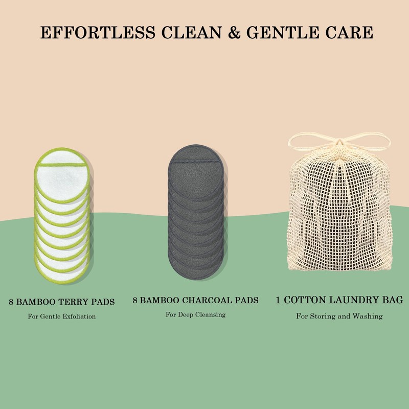 • SKINCARE POWER SQUAD. Our 16-pack includes bamboo charcoal rounds for gentle yet effective cleansing and bamboo fiber pads for silky-smooth toning. Tackle every step—makeup meltdowns, serum application, or gentle exfoliation—with these sustainable beauty tools that elevate your daily routine