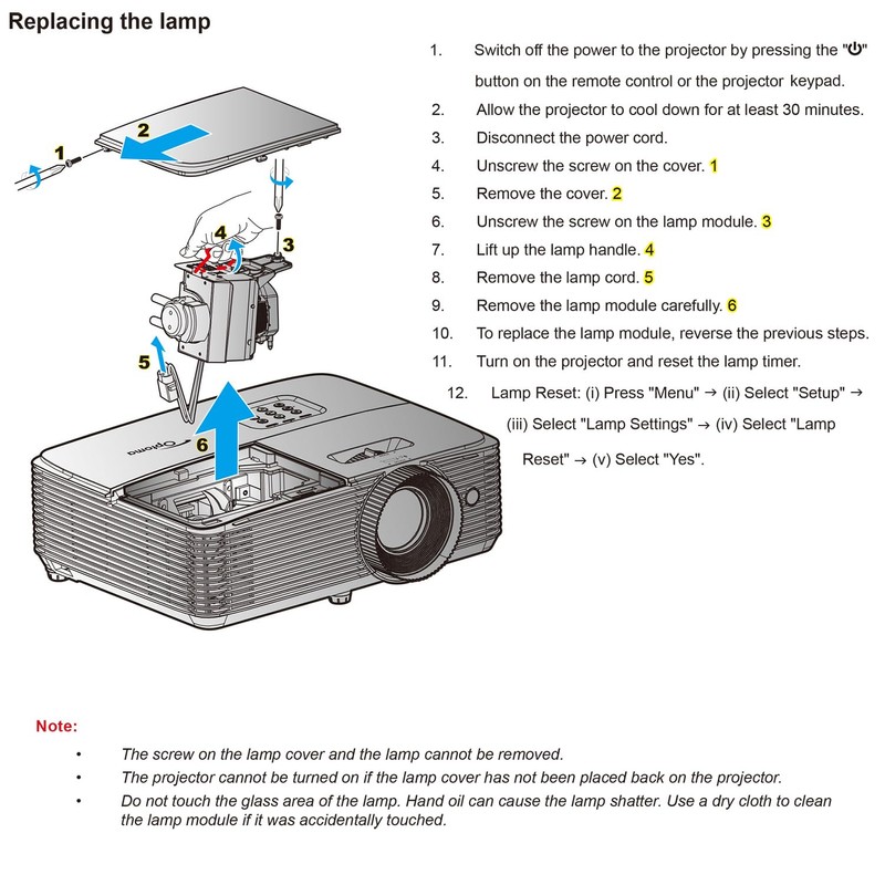 1. Make sure the projector is unplugged and sitting on a flat surface