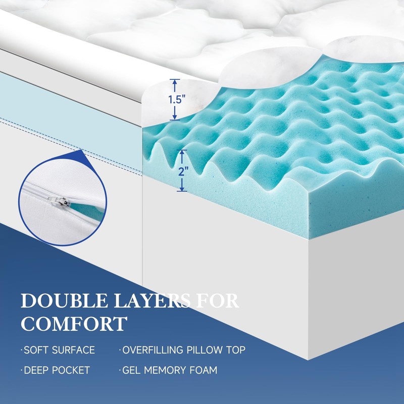 - 【2 In 1 Dual Layer Design】The dual layer mattress topper is 2 inches cooling gel egg crate memory foam plus 1.5 inches down alternative pillow top mattress pad. It can become a 3.5 inches thick mattress topper, which not only fluffiness and comfy, but also has strong support. It's like getting a new mattress, and multifunctional use, such as guest room, camping, RV, and futon mattress, et.