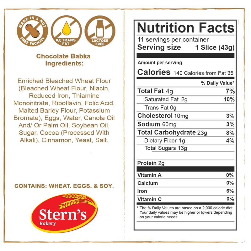 - FRESHNESS IN EVERY BITE! Baked fresh from scratch daily this babka bread is irresistible! We at Stern's Bakery look to bring you a whole line of scrumptious baked goods created from the finest, freshest ingredients (Non-Artificial)! Our babka cake is also kosher certified by the OK and CRC, dairy-free, and baked in a nut-free facility!