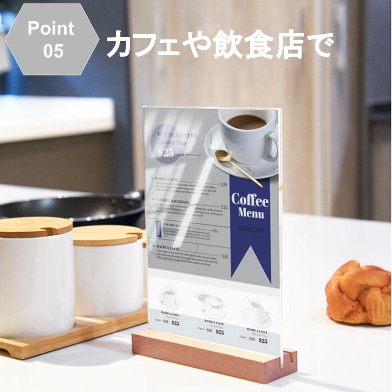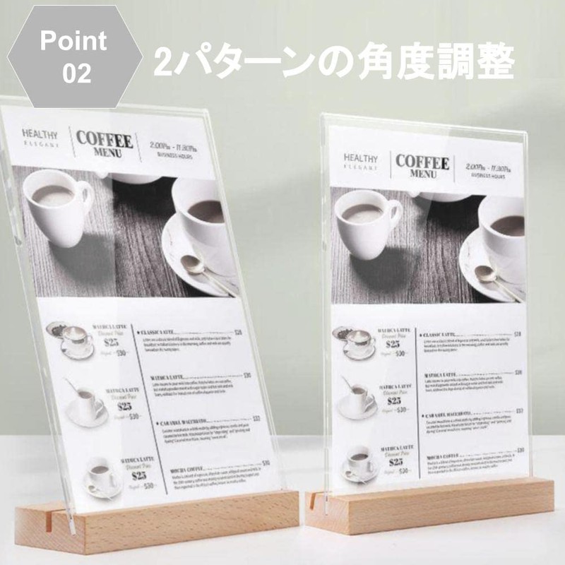 Stylish Wood Material: The thick wood base is made of highly transparent acrylic plate. Perfect for restaurants, café menu stands, storefront pop stands and more. Also doubles as a favorite poster stand. (2 Angles Patterns) You can choose between 2 patterns: vertical and diagonal. The menu can be easily installed by simply placing it on the acrylic plate. [Product Details] Size: A4 (Paper Size: 8.3 x 11.6 inches (210 x 297 mm), Weight: 12.7 oz (348 g), A5 (5.8 x 8.3 inches (148 x 210 mm), Weight: 3.5 oz (118 g), A6 (1000 x 150 g).