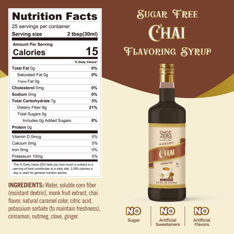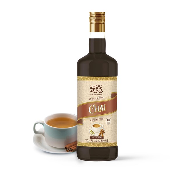 ChocZero Chai Flavoring Syrup, Sugar Free, Monk Fruit Sweetened, Prebiotic Fiber, Keto, Gluten Free, Vegan, No Sugar Alcohols – 25.4 Fluid Ounces