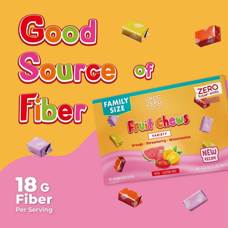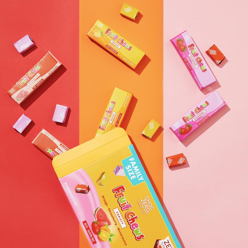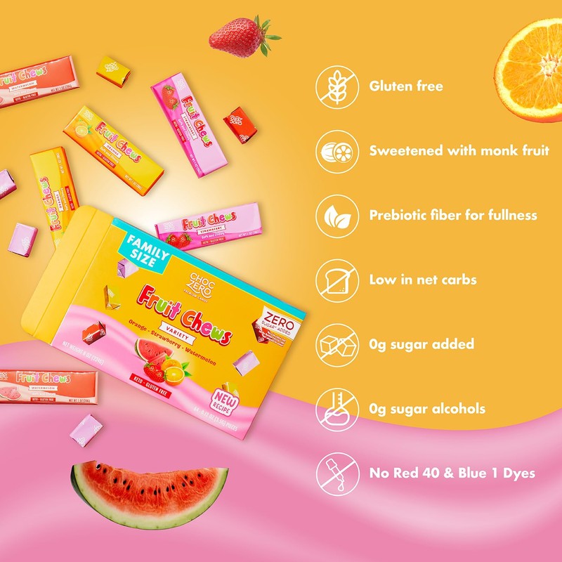 ChocZero Fruit Chews, New & Improved Recipe, Sugar Free Keto Taffy Candy, Orange, Strawberry, Watermelon Flavors, 8 oz