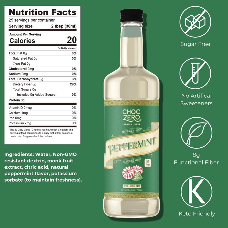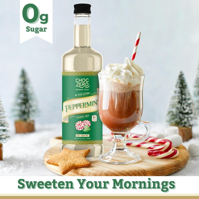 ChocZero Sugar Free Peppermint Syrup for Coffee - Keto Flavoring Syrups - Low Calorie Simple Syrup for Flavored Drinks (26.5 ounce bottle/750ml)