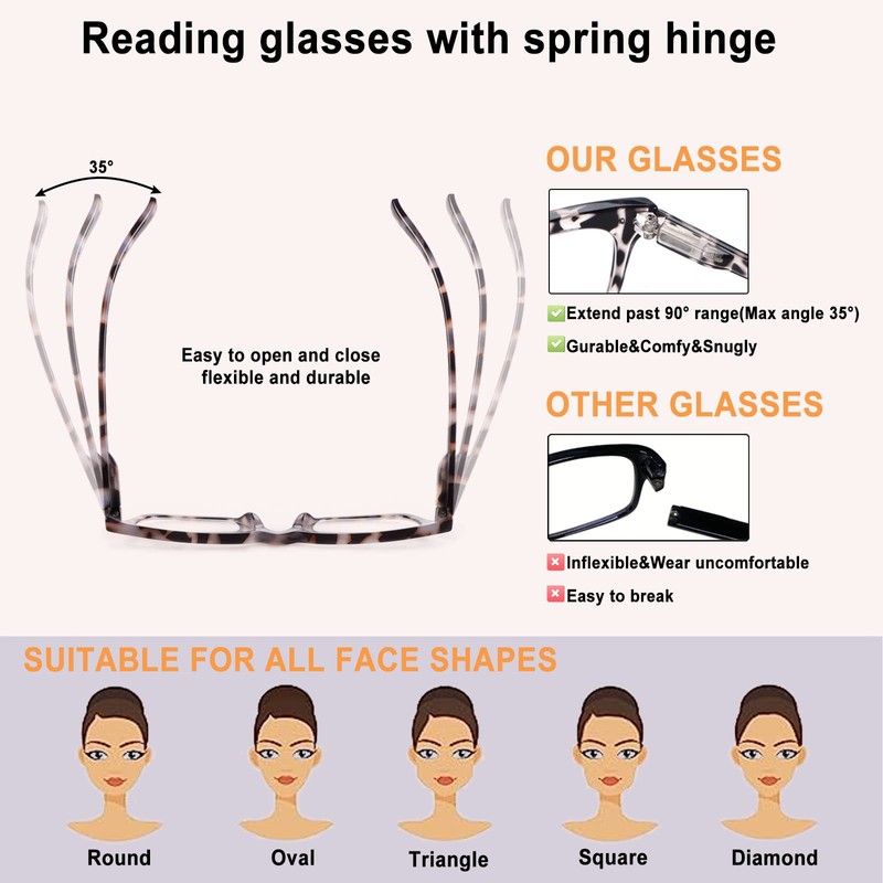 - Ergonomic Design: Extra light acrylic frames that are scratch resistant and anti-slip; Large eyewear frame has a flexible spring hinge design to accommodate all face shapes