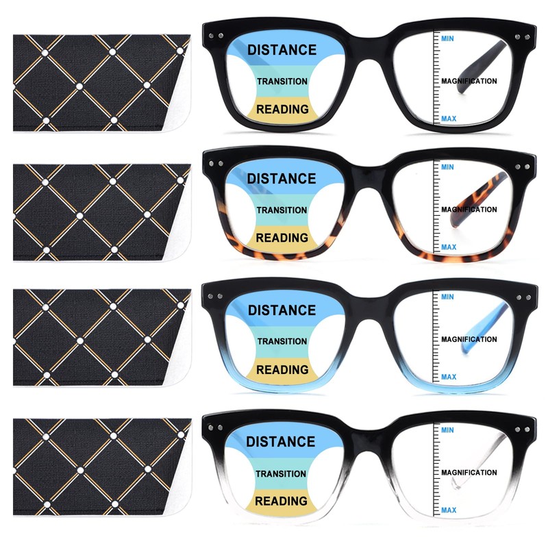 Package Content: 4 xBlue Light Progressive Multifocus Reading Glasses, 4 x Soft pouches, 1 x Cleaning Cloth. All packaged in a mail box
