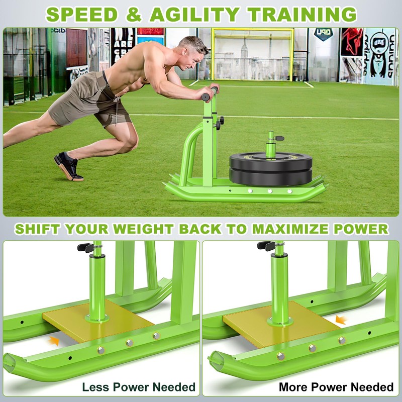 handle height for various exercises, targeting both lower and upper body muscles. This football push sled boosts