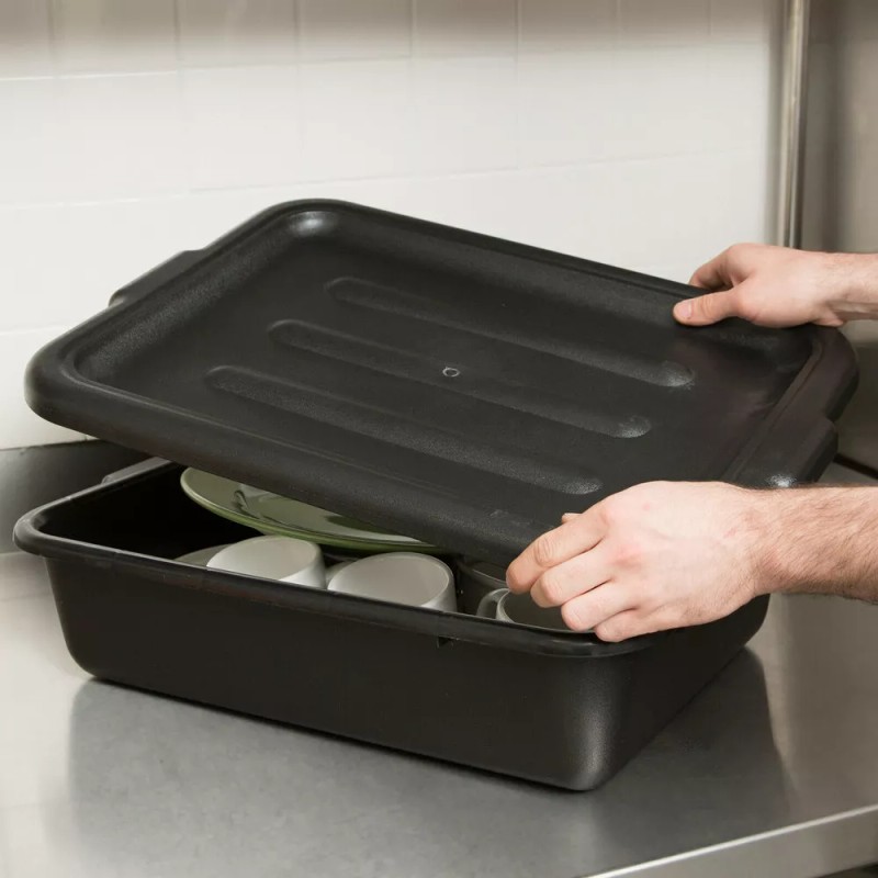 Featuring a sleek black color that won't detract from the fine furnishings at your venue, this 20" x 15" polyethylene plastic bus tub lid ensures storing and transporting dirty dishes from table to warewashing station is done in a discreet manner that's effective, too. Simply cover your existing compatible bus box with this lid, stack multiple covered bus boxes, if necessary, and you're set to transport soiled dishes wherever they need to go!