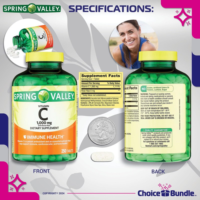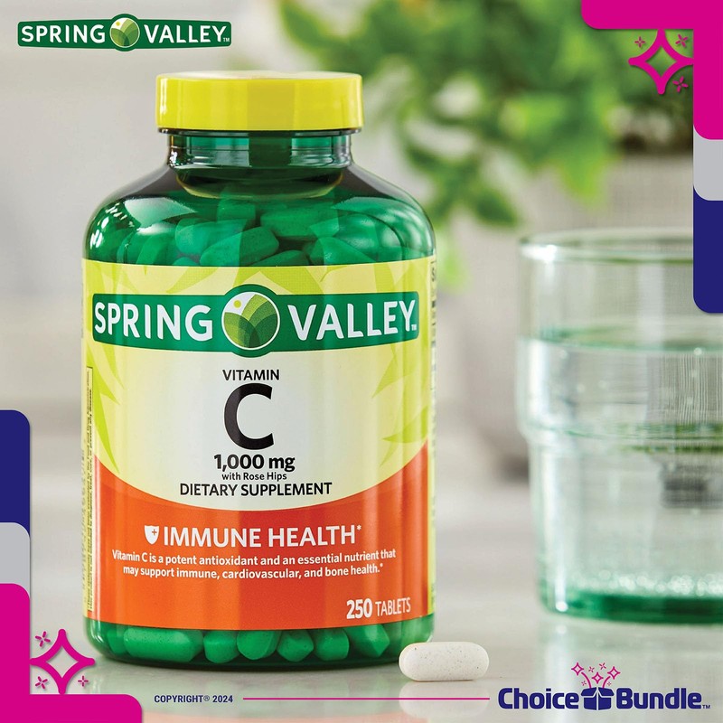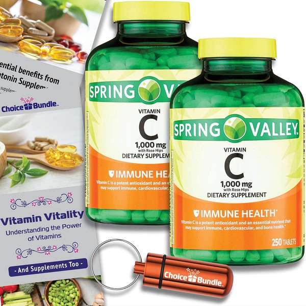 - ✅ Your Bundle: 2 x Spring Valley Vitamin C with Rose Hips Tablets Dietary Supplement, 1,000 mg, 250 Ct, Choice Bundle Vitamin Guide & Pill Buddy keychain pill container.