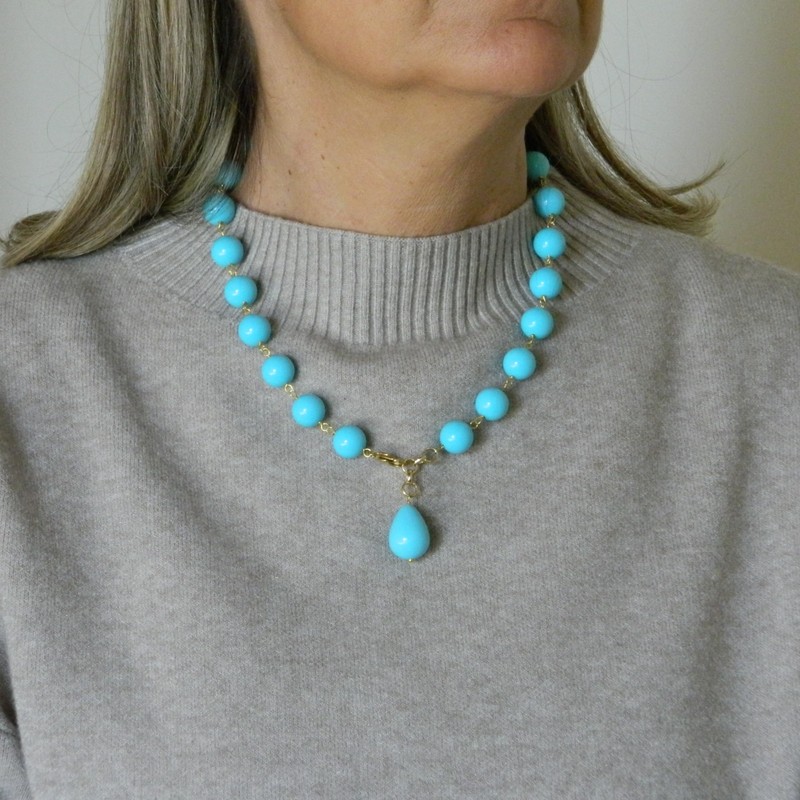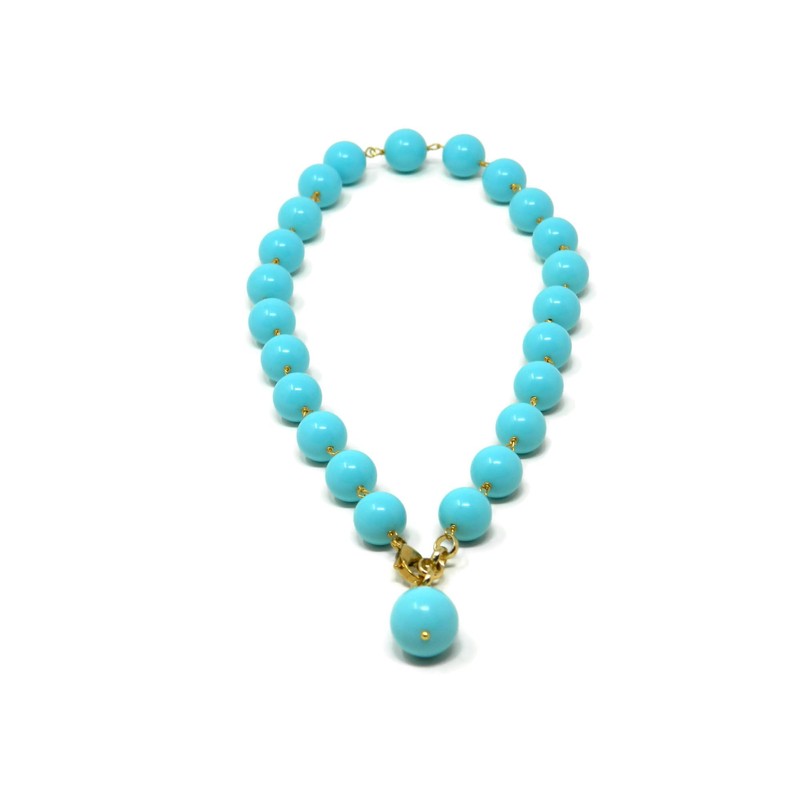 Necklace with 12 mm smooth balls and 15x20 mm pendant drop of turquoise paste. Golden aluminum chain and lobster clasp closure. Length: 49 cm (19.29in).
