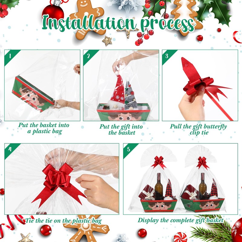- Christmas Color Theme: embodying the atmosphere of Christmas, our Christmas baskets empty come in traditional festive colors that easily create a holiday atmosphere; Wrapped in quality transparent bags with cute drawstrings, your gifts will not just be distinctive but will also be clearly visible