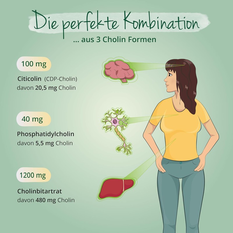 - Optimal dosage: as with all nutrients, it is also important for choline to avoid both an undersupply and an oversupply. Since choline in high concentrations is only contained in animal products, vegetarian or vegan people often have a choline deficiency. In addition, pregnant women and breastfeeding women, as well as physically active people have a significantly higher choline need. With 506 mg of choline per daily dose, our capsules are perfectly dosed.