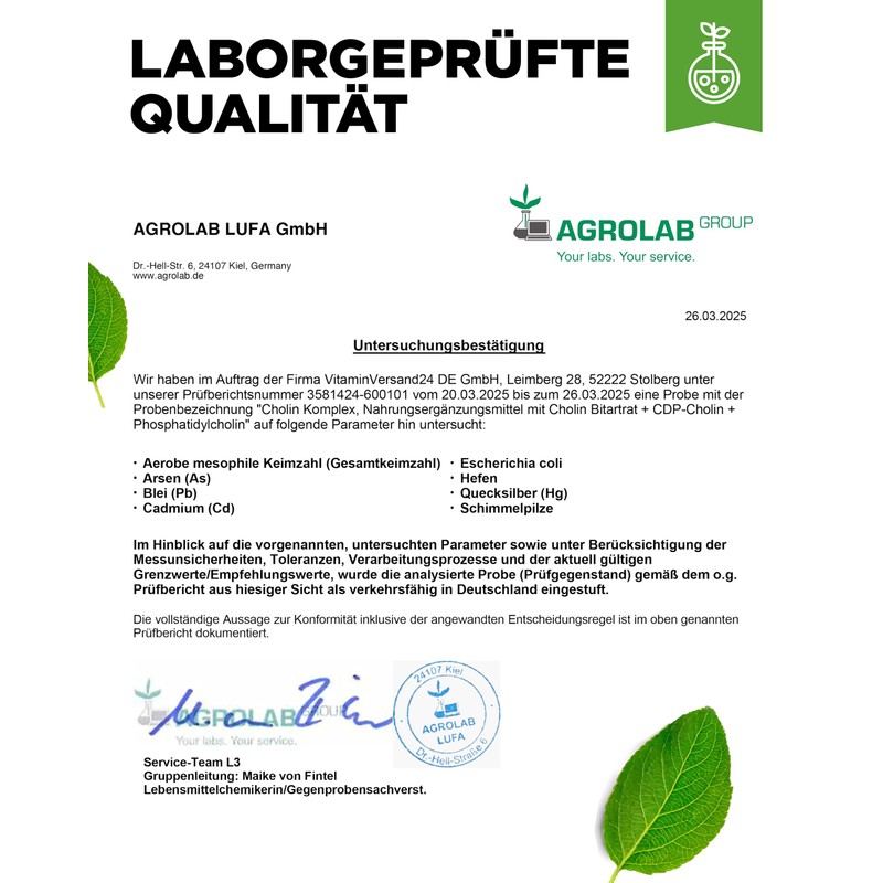 - With 3 choline compounds: Choline is not the same as choline, different compounds differ in choline content, bioavailability and effect. For a particularly high-quality product, we not only rely on choline bitartrate (like many other suppliers), but also combine it with citicoline (CDP-choline) and phosphatidylcholine (PC/lecithin). This synergistic combination ensures optimal care. GPC choline, which resembles CDP choline in its action, rounds off the variety of forms available.