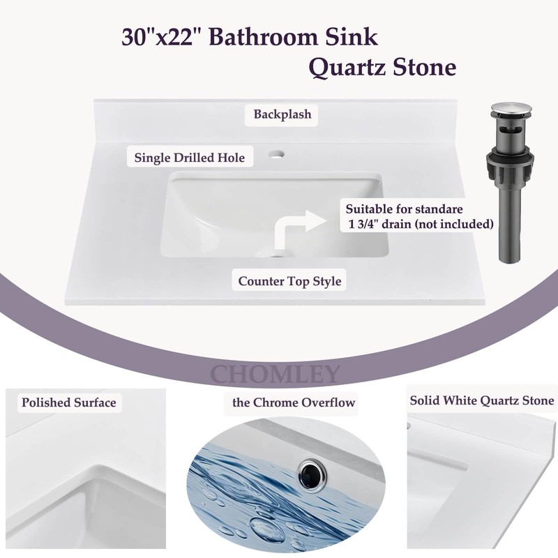 - 【Quality Material】 The vanity top with sink is made of heavy-duty Quartz Stone. the solid white surface of the vanity top offers timeless elegance and versatility, the solid white surface of the vanity top offers timeless elegance and versatility. It is highly sturdy & waterproof & easy to clean, and resistant to scratches.
