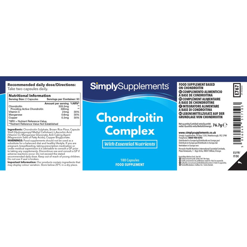 • CHONDROITIN - At Simply Supplements we select Chondroitin Sulphate for use in our supplements as this has a similar structure to Chondroitin naturally produced by the human body and is proven to work most effectively.