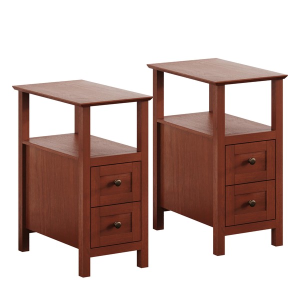ChooChoo End Tables Living Room Set of 2, 3-Tier Narrow Nightstand with with 2 Drawers, Slim Bedside Tables for Living Room, Bedroom, Small Space, Cherry Brown