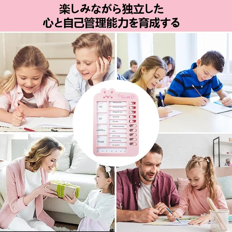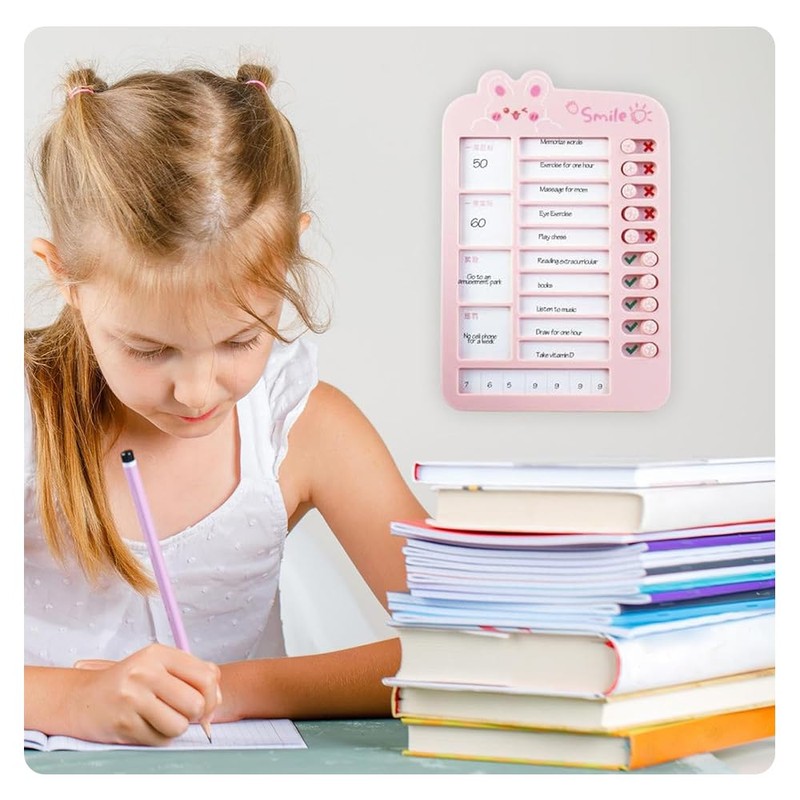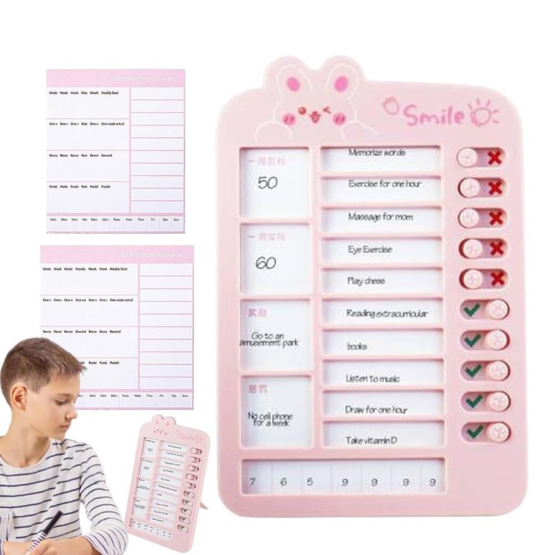 Improve your child's organizational skills with the Checklist Slider Board. This sliding household chore chart for kids is perfect for daily tasks, studying and improving time management skills. Exquisite workmanship, round corners without burrs, smooth edges without burrs, no hurt children's hands. Advantage: 1.Positionable Hidden Bracket Square 2.Hanging Small back hole for space saving hanging Specifications: Material: ABS+Paper Product Size: Approx. 5.7 x 8.5 inches (14.5 x 21.5 cm); Package Contents: 1 x Time Clock English (Pink Rabbit) 13 x Blank Planning Pages.