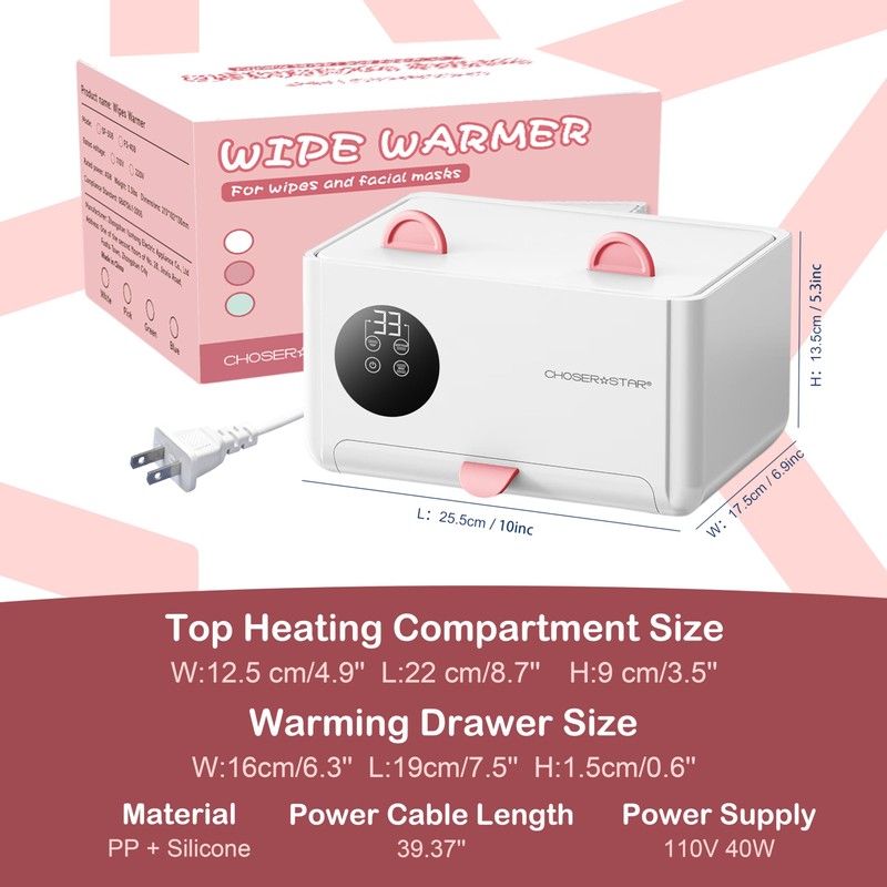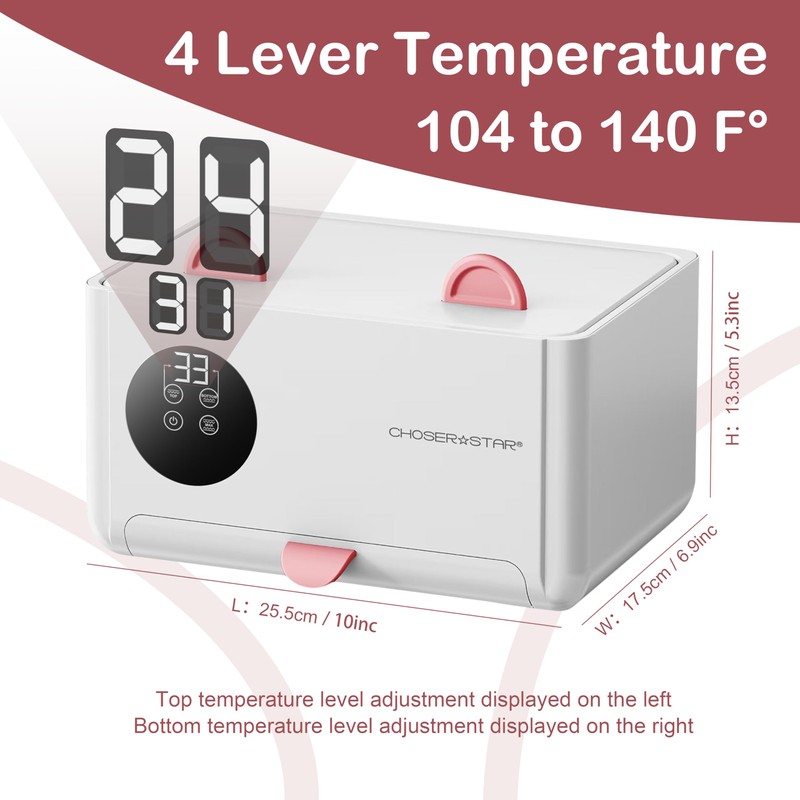• 4 Custom Temperature Modes C Choose from 4 temperature settings to warm baby wipes or sheet masks precisely, keeping them moist and soothing without overheating or drying out.