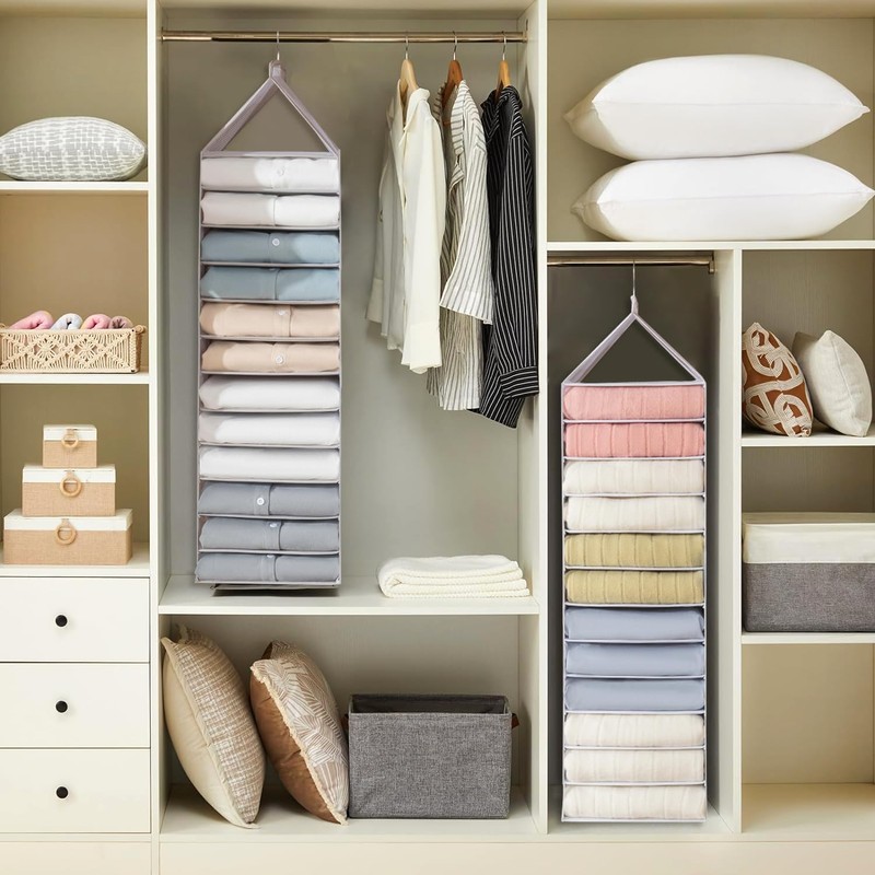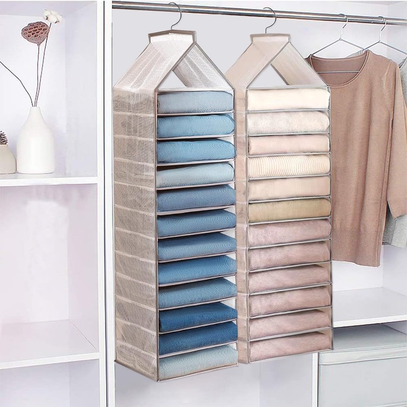 The hanging wardrobe organiser is easy to install, you just need to attach it to any rod and you have extra storage space. And foldable design is very convenient to carry.