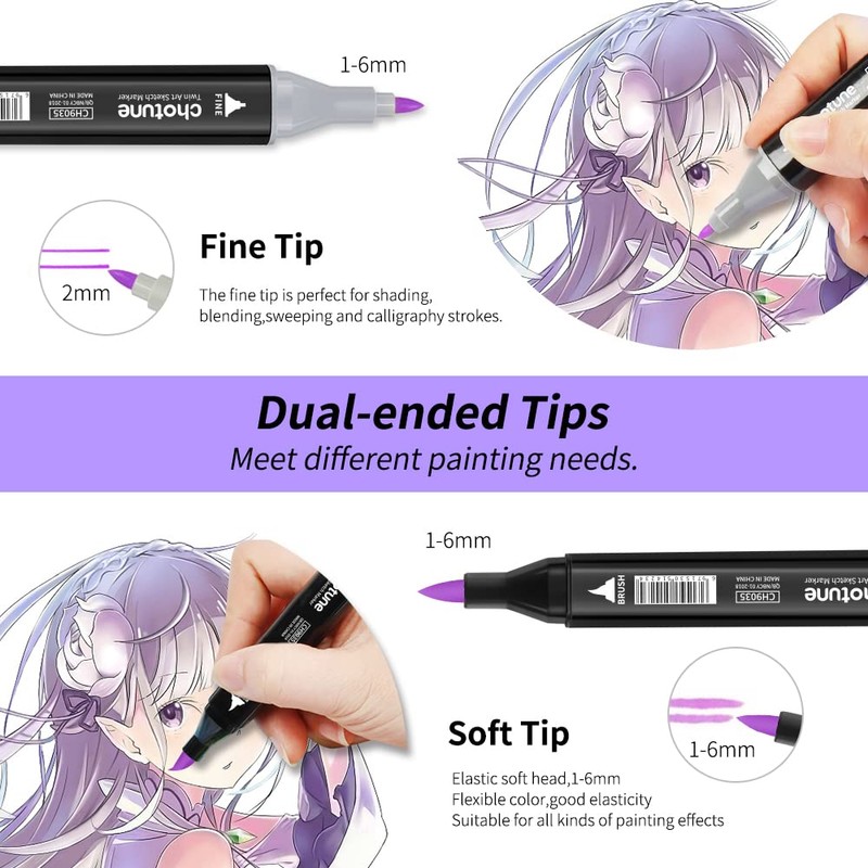 • Soft brush and fine double tip: CHOTUNE alcohol art marker set expands your artistic horizons. Choose the soft brush tip for sweeping, calligraphic strokes or for quickly colouring large areas. Meanwhile, the fine tip can be used for writing, sketching, detailing and contouring. The two different tips meet your different drawing needs.