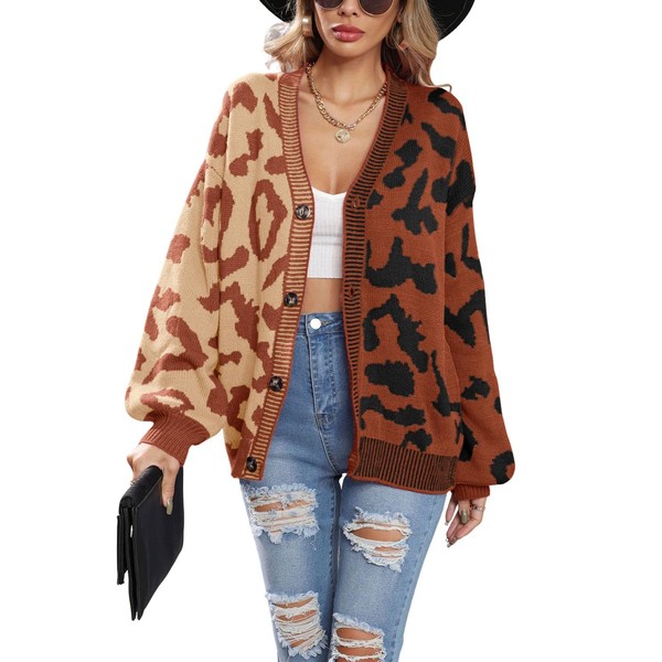chouyatou Women's Color Block Leopard Print Button Down Long Sleeve Cardigan Sweaters (X-Large, Brown)