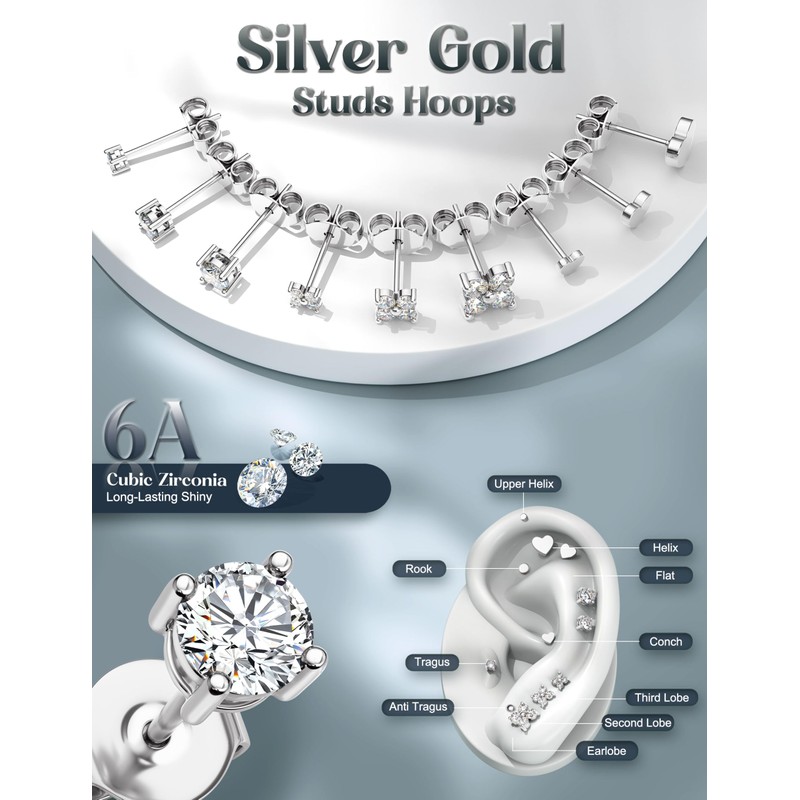 Crafted from tarnish-resistant 925 silver earrings with 18K gold plating, these durable pieces maintain their shine through daily wear. The stud earrings feature secure butterfly backs while the small silver hoop earrings for women have flexible clasps for comfortable all-day wear. Choose between classic silver earrings or elegant gold earrings to match your personal style. These lightweight earrings are ideal as cartilage earrings, tragus jewelry, or simple lobe piercings.