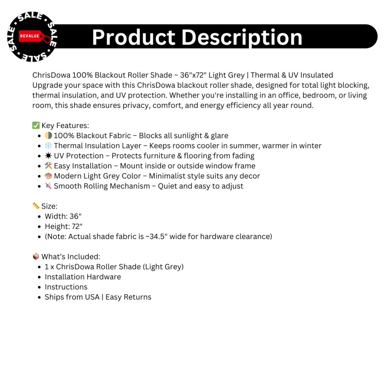 ChrisDowa 100% Blackout Roller Shade – 36"x72" Light Grey | Thermal & UV Insulated