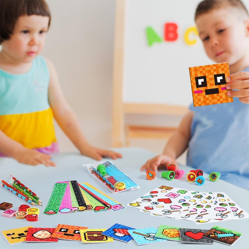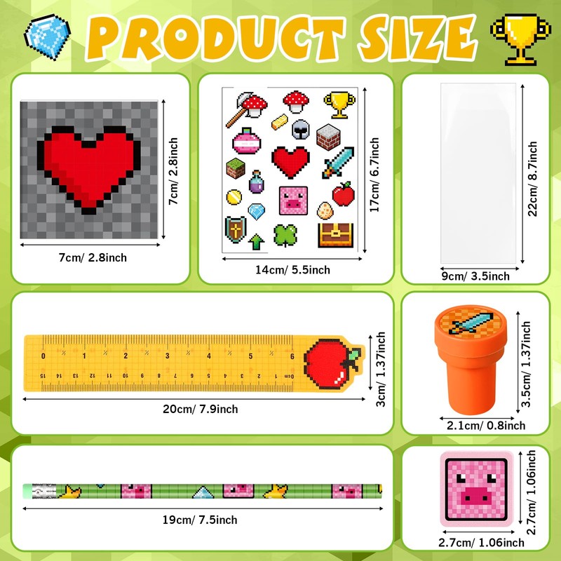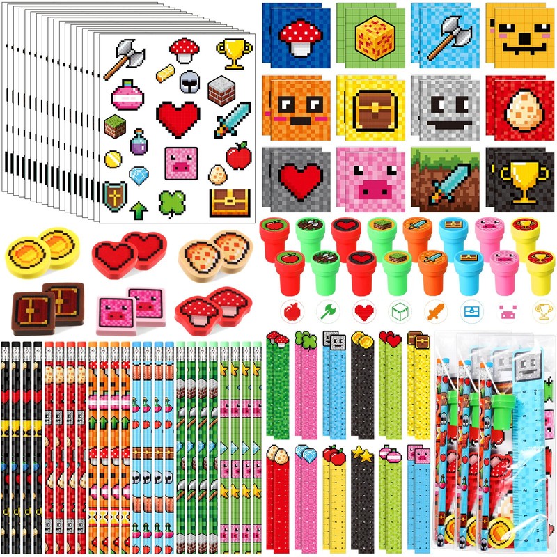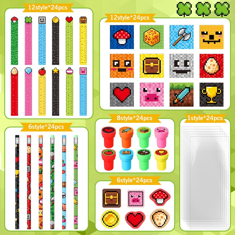 - Pixel Miner Party Favors: you will receive 24 pieces of pixel stampers, 24 pieces of pixelated pencils, 24 pieces of pixel miner erasers, 24 pieces of rulers, 24 pieces of pixel theme notepads, 24 sheets of pixel miner stickers, package come with 24 pieces of OPP bags for packaging; Sufficient quantity and interesting combination to meet your pixel birthday gifting demands