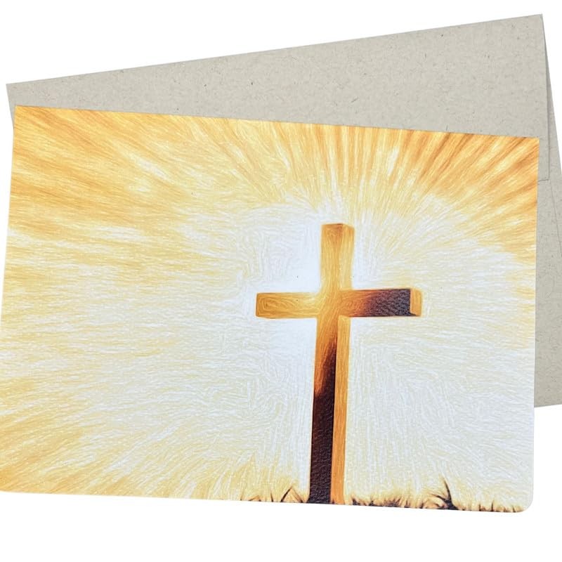 Christian Card with Cross (7X5 Inches and Blank Inside for All Occasions) Religious and Spiritual Themed Simplicity with a Wooden Cross in the Sun - 285