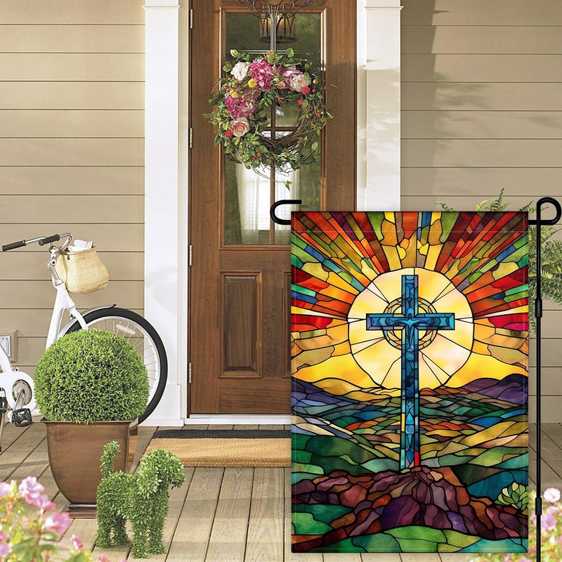 Christian Cross Religious Garden Flag 12x18 Inch Double Sided Jesus Stained Glass Style Garden Flag 3Ply Durable Fabric Christ Garden Flags for Outside Lawn House Outdoor Yard Sign Garden Decor