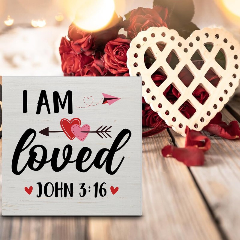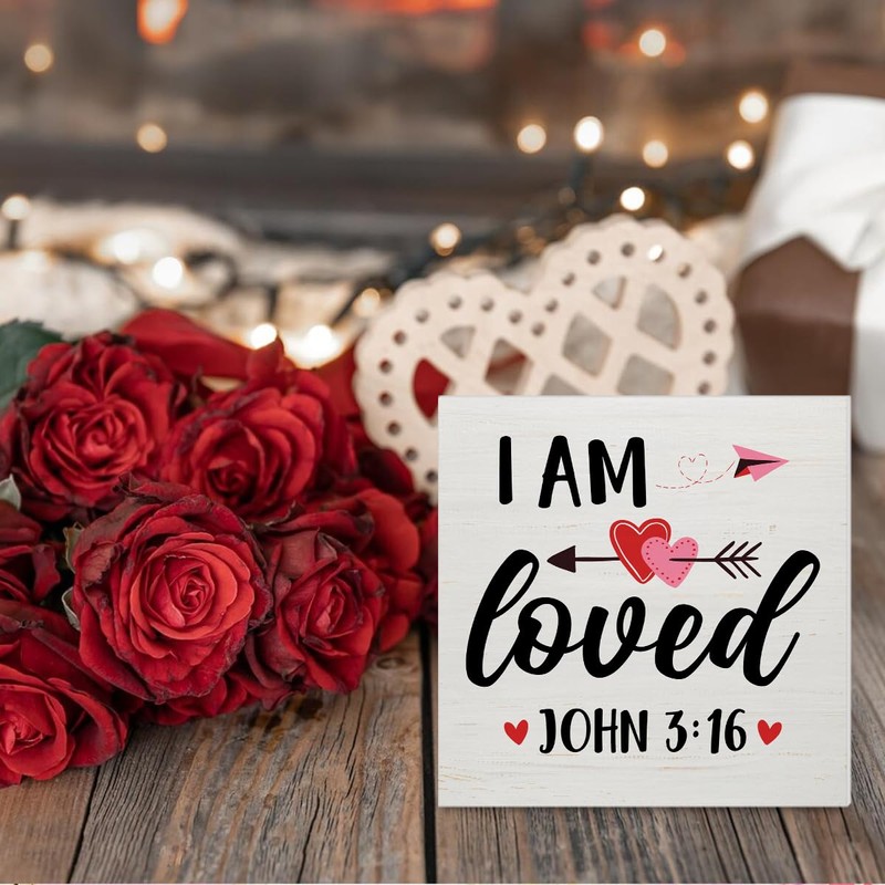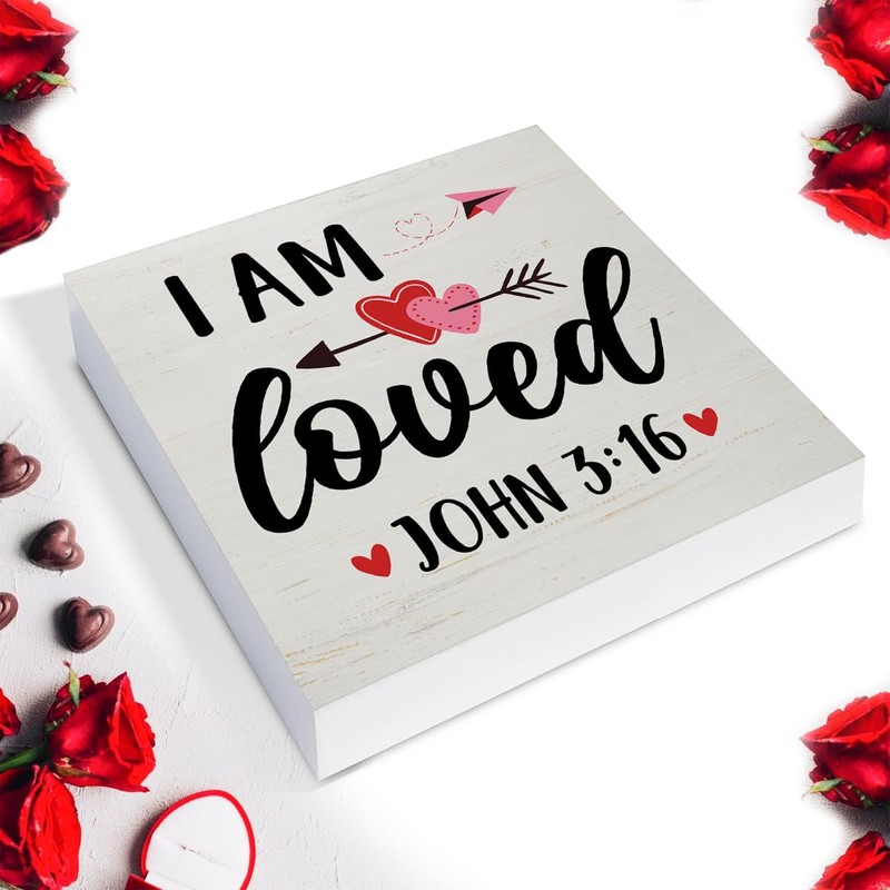 Christian Desk Decor, Rustic I Am Loved Scriptures Wooden Sign Home Tabletop Shelf Desk Decoration, Valentines Day Decorations