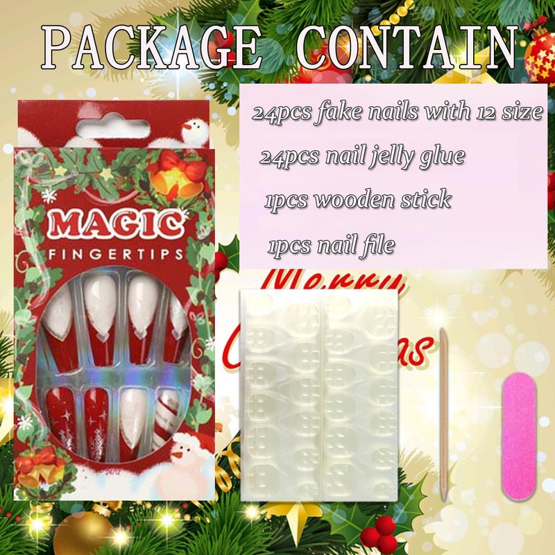 - 【Includes Tool Kit】You'll get 24 cute Xmas false nails in 12 sizes. 1 mini nail file, 1 small wooden stick, 1 piece of nail glue sticker. Christmas glue on nails are perfect for most people's nails.