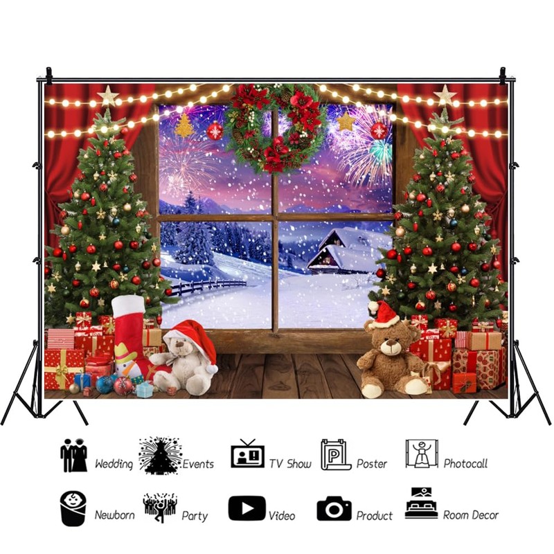 Christmas Backdrop 5x3ft Christmas Tree Gift Box Photography Background Snow Scene Outside the Window Photography Backdrop New Year Party Decoration Background