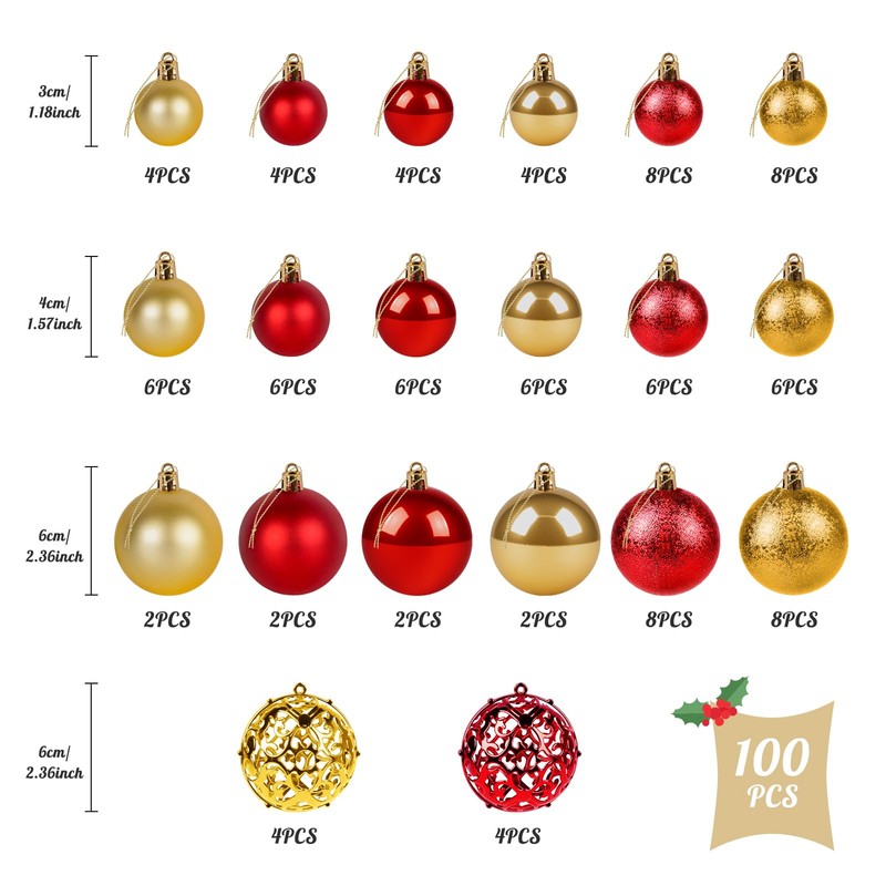• 100 Christmas baubles set: 3 different sizes, including 3 cm, 4 cm and 6 cm diameter, enrich your Christmas