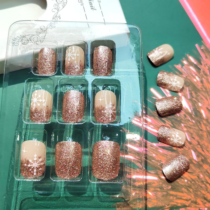- Package Contents: Package with 24pcs christmas bling winter holiday extra short square coffin gold glitter full cover press on nails with snowflake design,24pcs jelly glue stickers,1pc nail file,1pc wooden stick.Difference sizes artificial nails can repeated use,you can trim it to any length you want,no need to buy other things,you can get acrylic press on nails