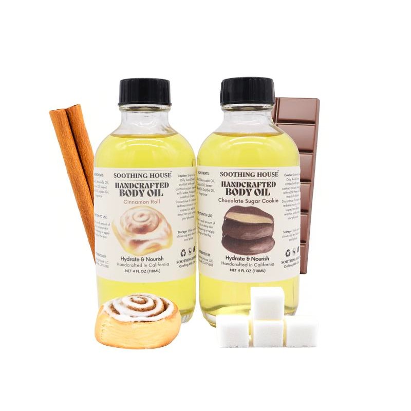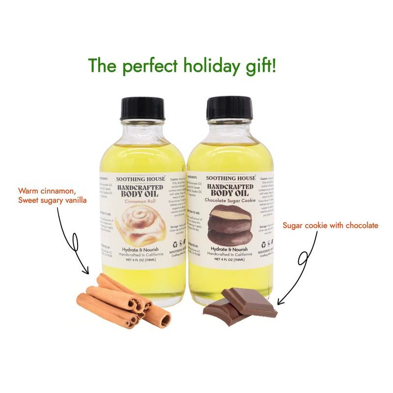 Celebrate the warmth and comfort of the holiday season with our exclusive Christmas Body Oil Bundle. This luxurious duo combines the scents of Chocolate Sugar Cookie and Cinnamon Roll, each crafted to indulge your senses while delivering intense moisture and nourishment to your skin. With every order, you’ll receive convenient droppers, making it easy to enjoy just the right amount of these festive oils.